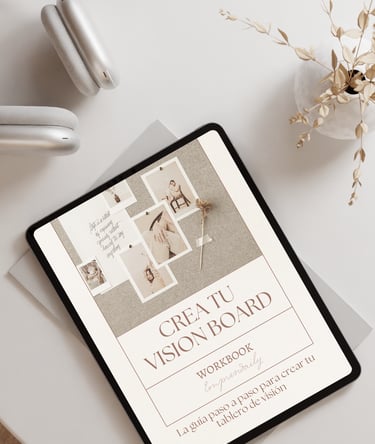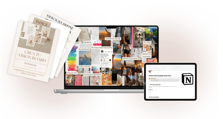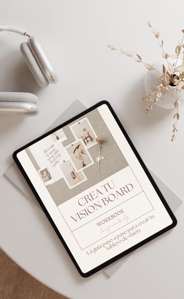 Y con esta base para crear tu tablero de visión, hay ciertas pautas extra que desde que las aplico, absolutamente todos mis vision board se han cumplido. Estas claves, y el proceso completo con ejemplos, las explico en el Vision Board Workbook, una guía paso a paso para crear un vision board efectivo para 2024.